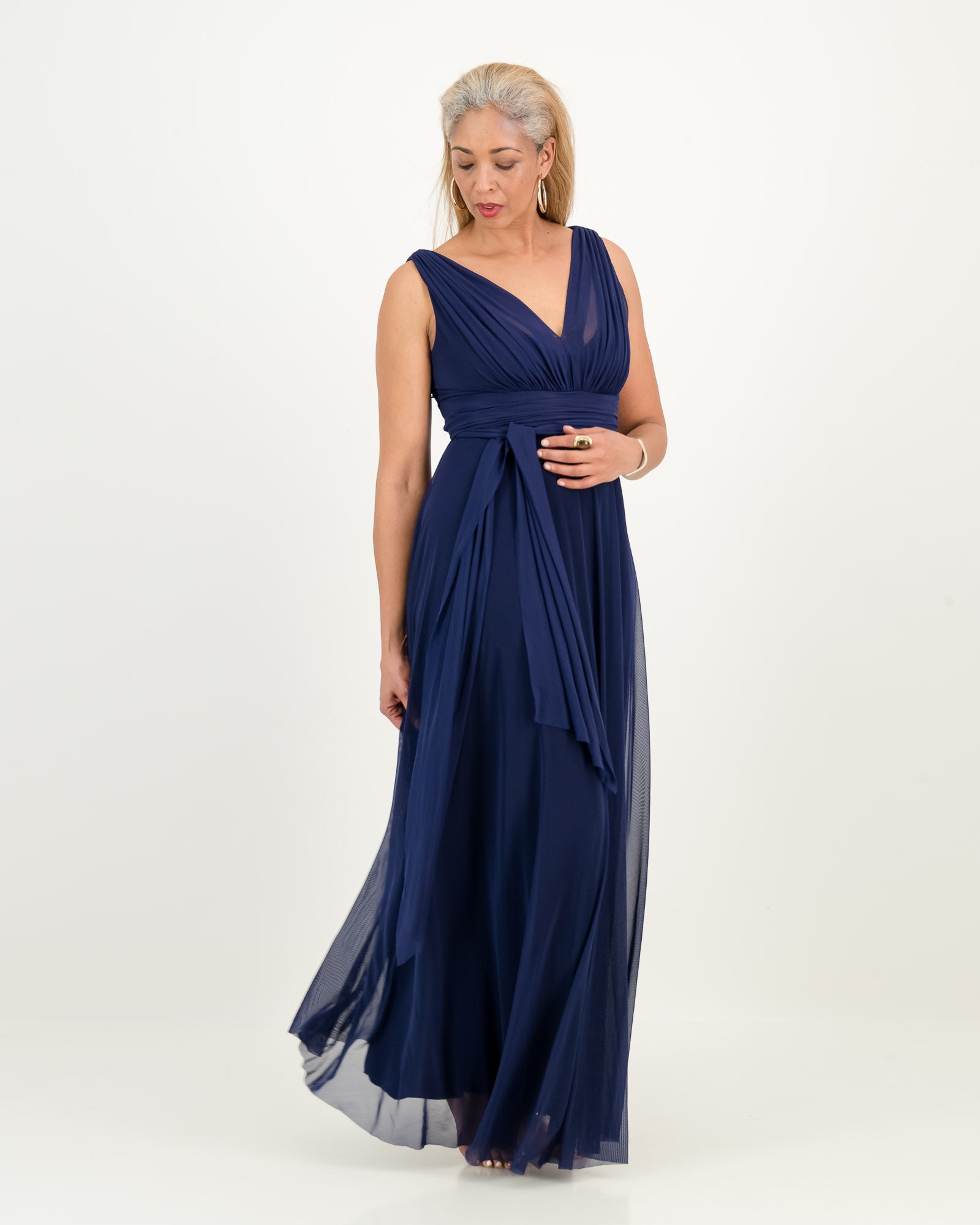 This glamourous evening dress is an absolute classic and wonderfully flattering for all body shapes. The plunging v-shaped neckline and wrap-around sash under the bust allow for an ultra-feminine look. Soft mesh gathers over the bust and back to create fit. This dress is fully-lined in a heavyweight, stretch bon-bon fabric with a soft overlay of glamorous mesh.