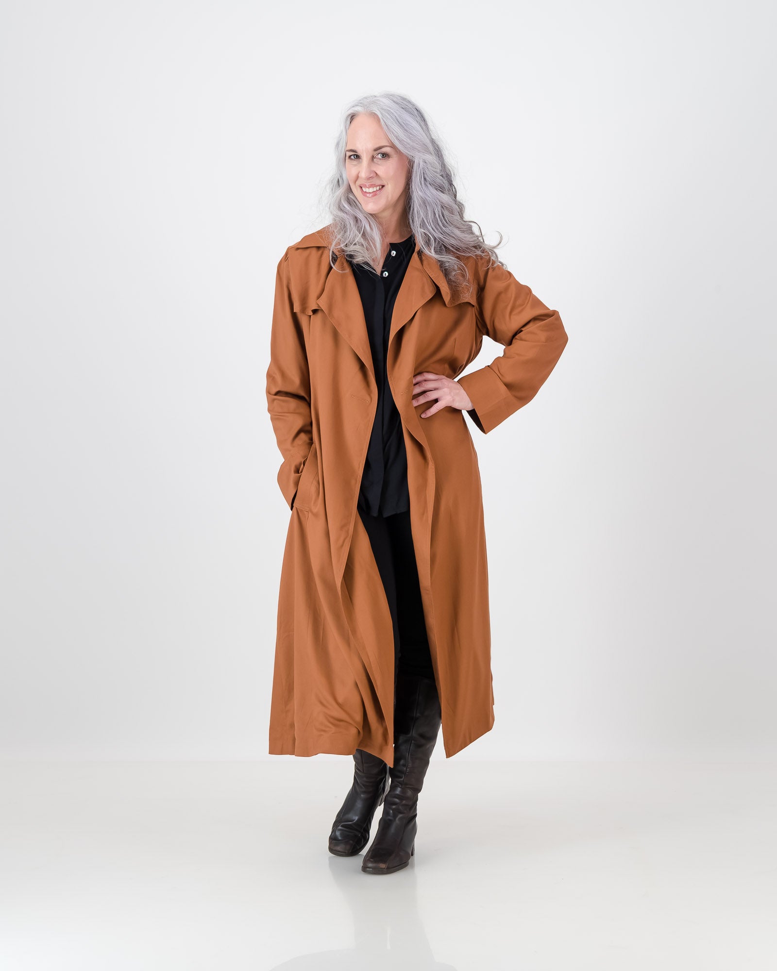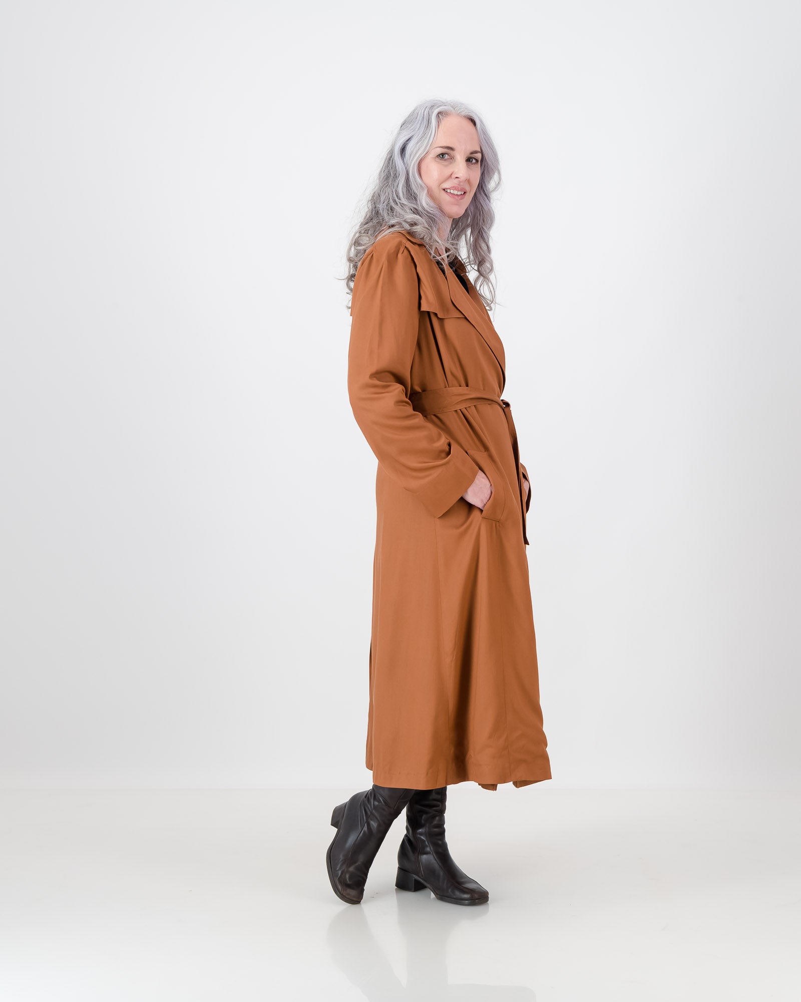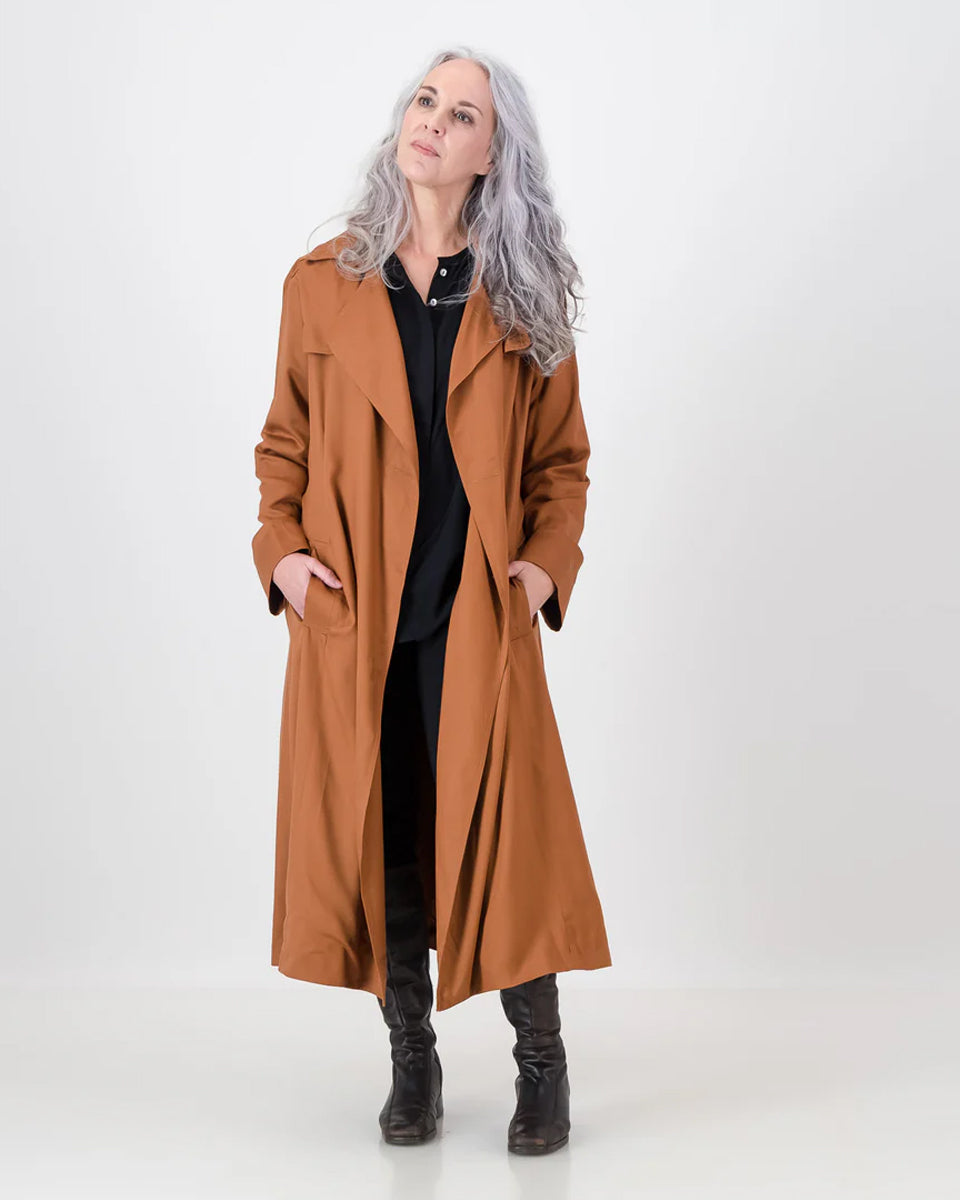 The ilsa features a belt for a cinched waist, a back vent for ease of movement, and an unique storm flap collar that adds a touch of sophistication. And, of course, it includes pockets- because what’s a trench without pockets?