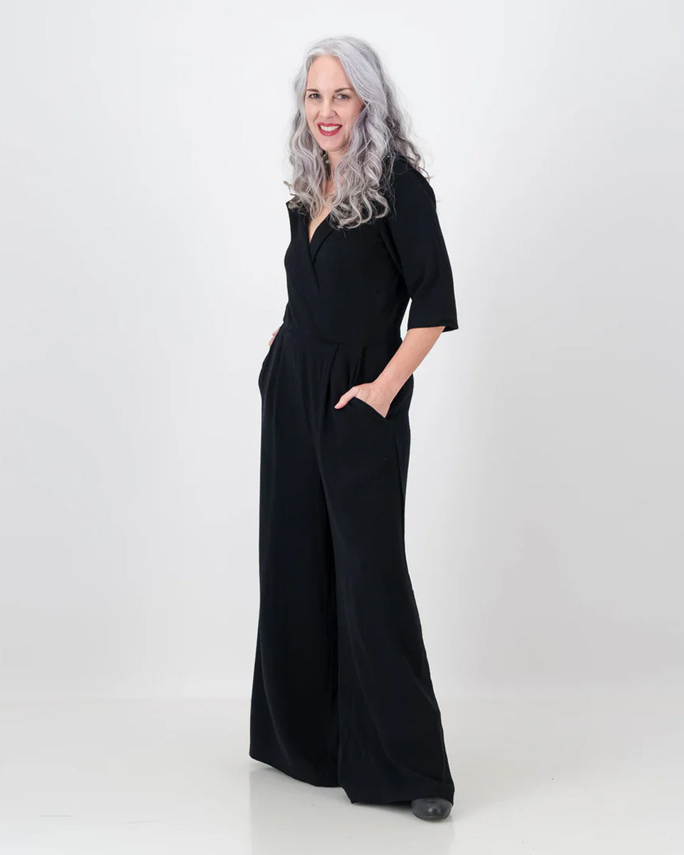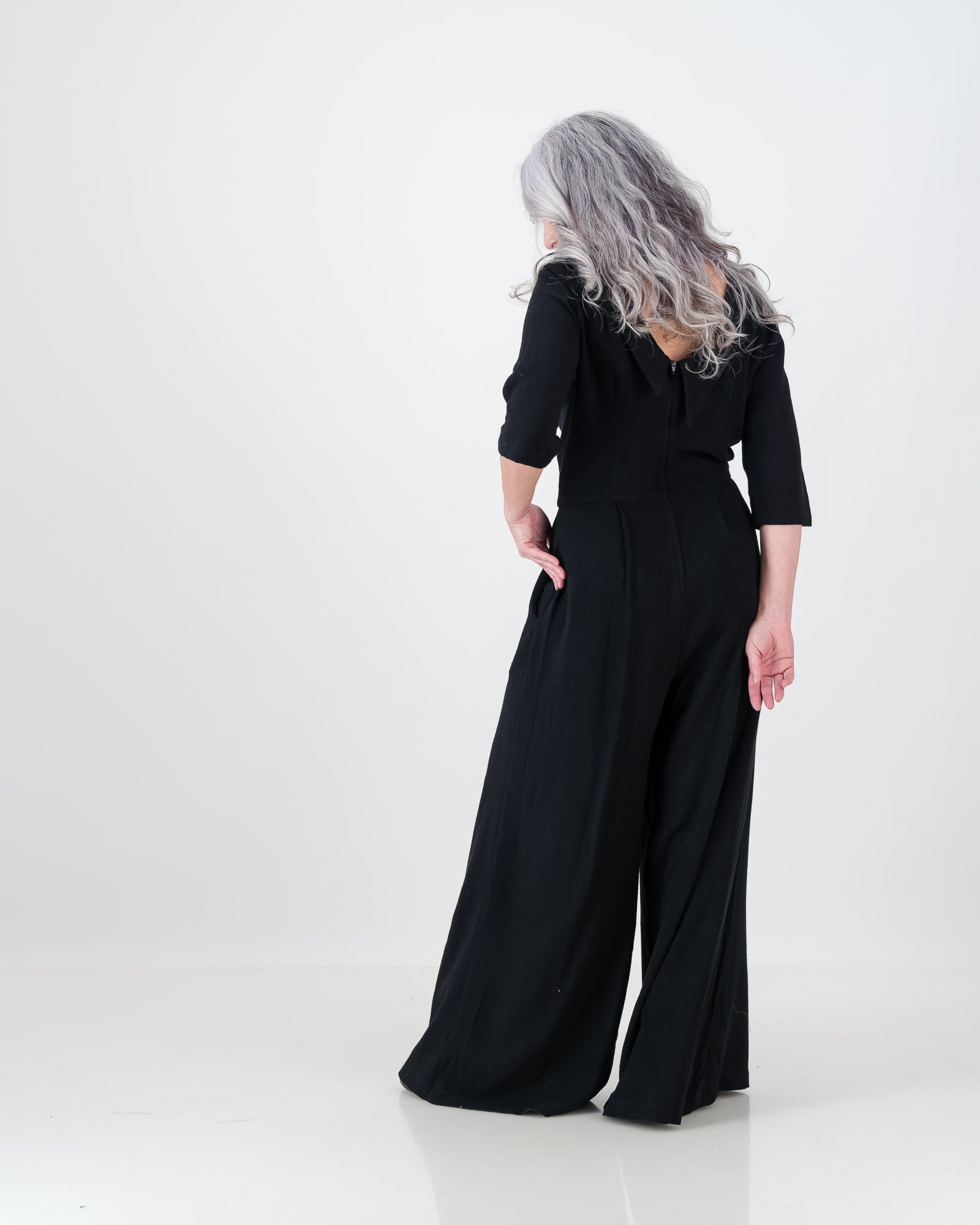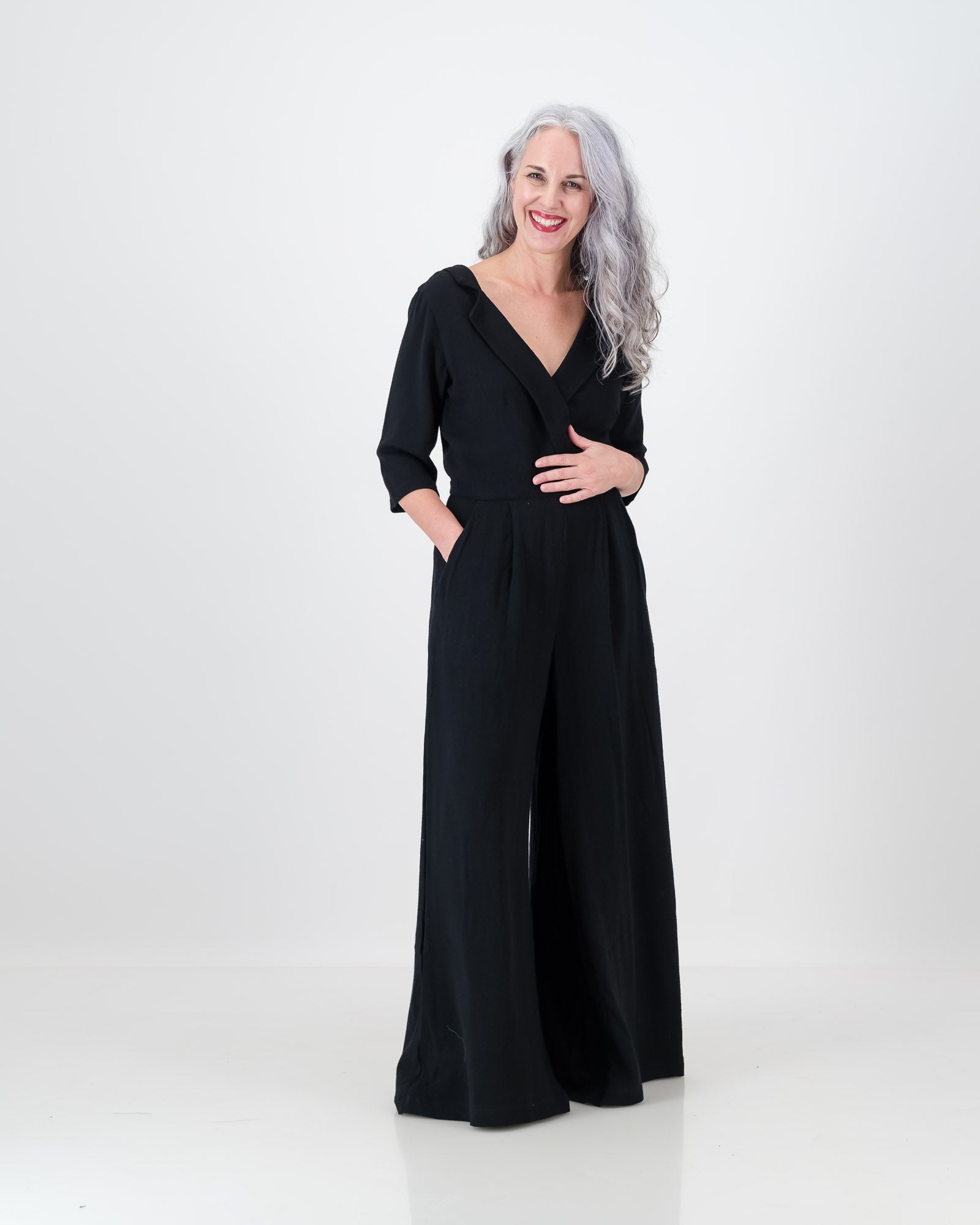 Meet the jojo jumpsuit - the epitome of casual chic! This will be your new favourite go-to trans-seasonal piece. The detailed asymmetrical collar gives jojo a touch of whimsy whilst the lined fitted bodice, and wide-leg trousers elevate the look. Designed for bespoke styling and a universally flattering fit. The best part ... pockets!