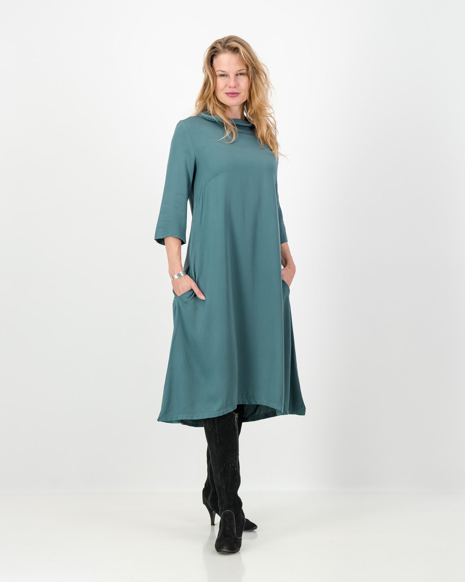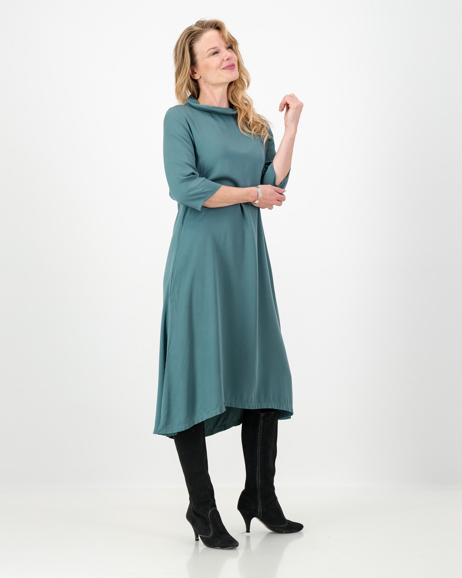 The mila dress is both effortless and elegant. This below knee-length dress is designed for easy days with sophisticated style. Featuring a soft roll collar and fitted ¾ length sleeves, mila boasts the perfect balance between comfort and chic.