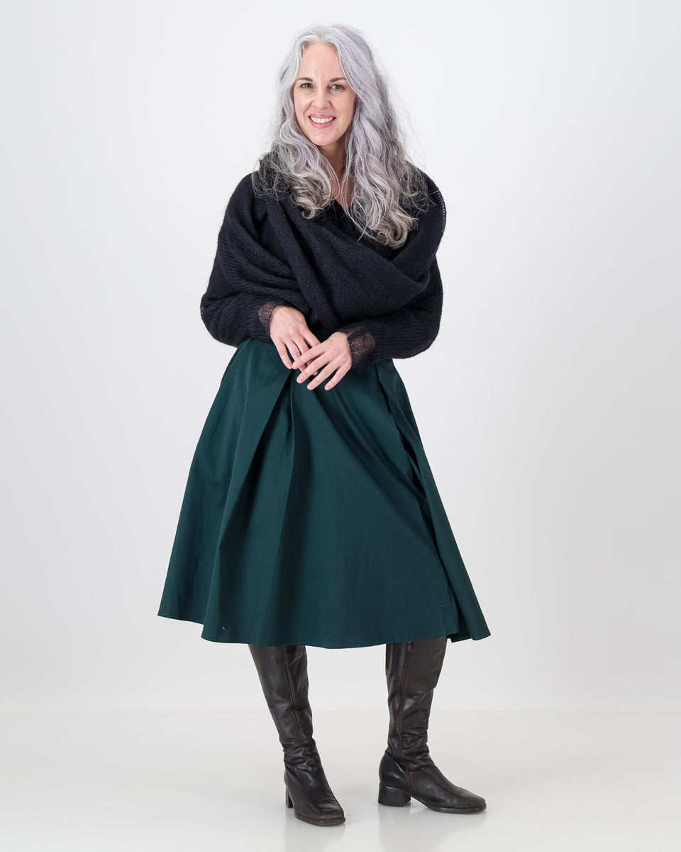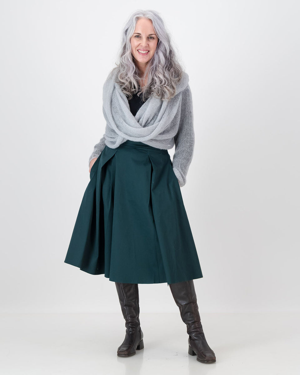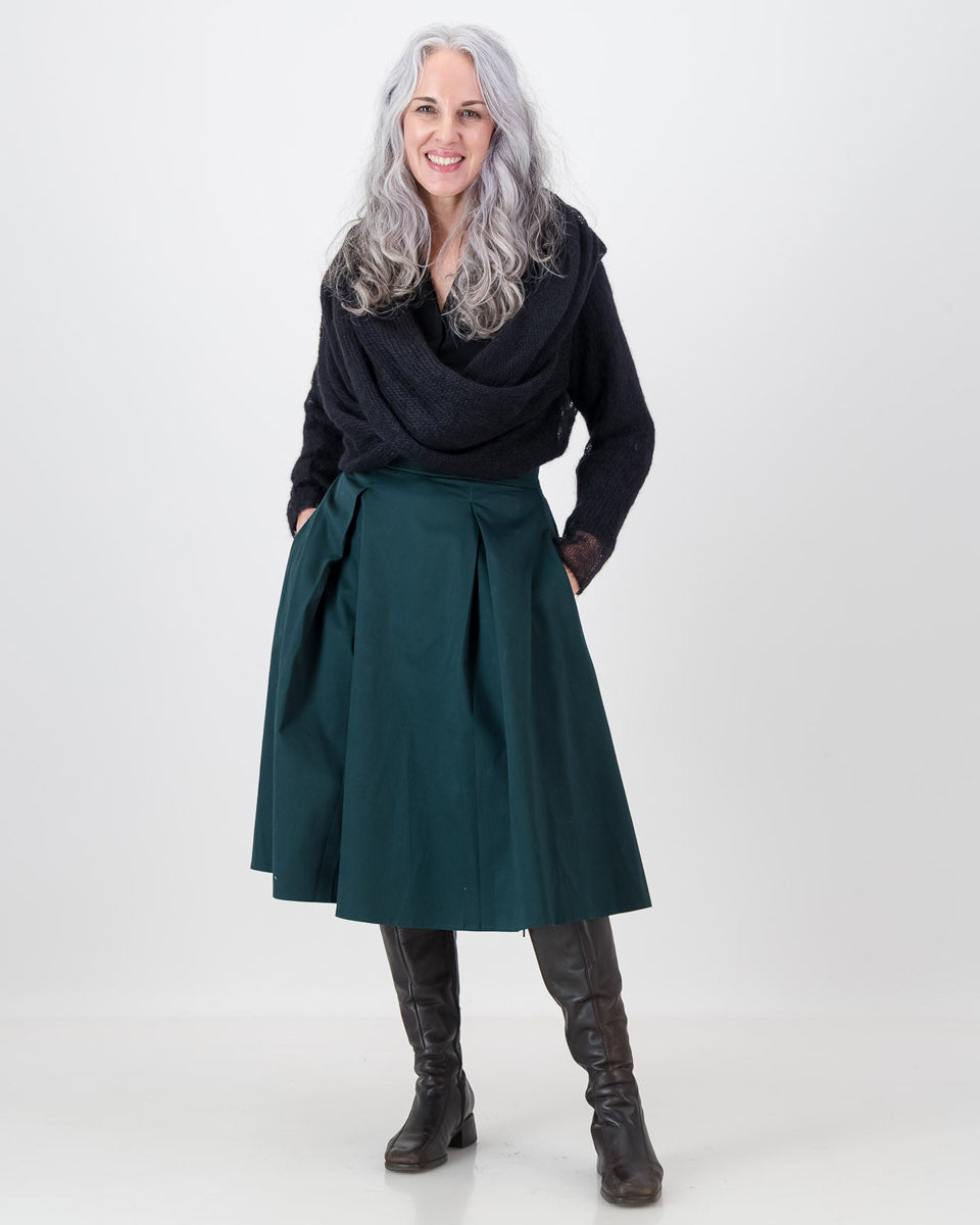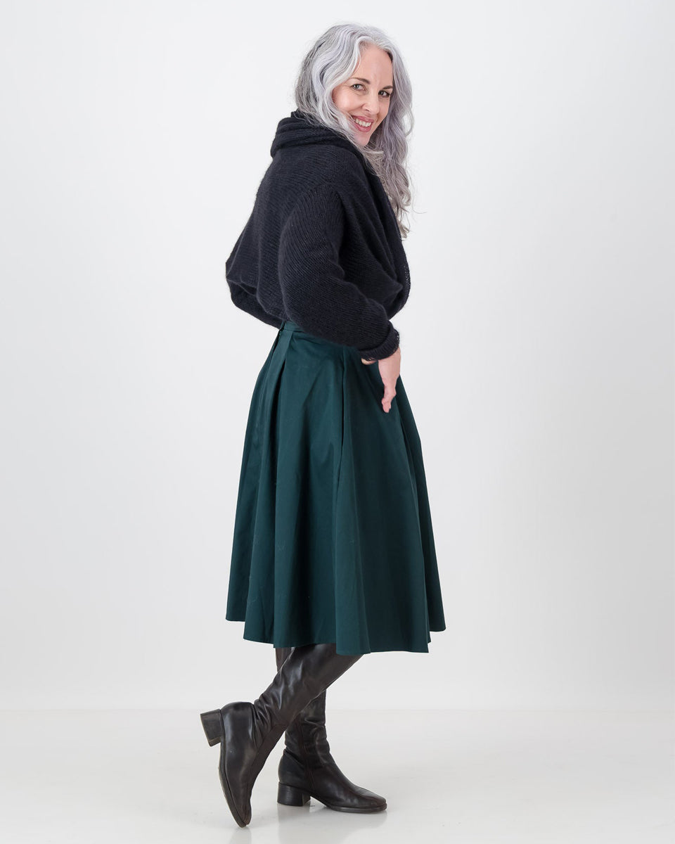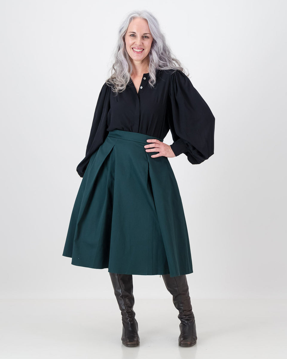 Meet the nkuli skirt – a versatile and stylish addition to your wardrobe. This knee length, pleated flared skirt features a thick waistband and a convenient centre back zip closure, ensuring both comfort and a flattering fit.