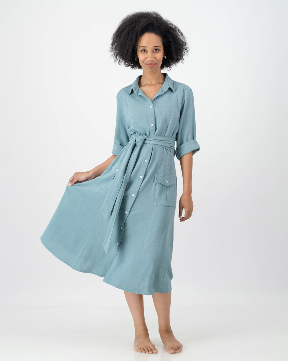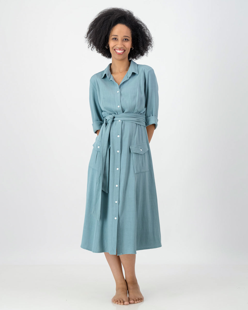 The emma dress embodies classic sophistication, perfect for sunny days spent in effortless style. Crafted from luxurious linen/rayon, this breezy dress keeps you cool and comfortable. Featuring ¾ sleeves and a structured collar, the emma dress is both practical and feminine. The waist tie accentuates your shape, while functional front pockets add a touch of utility.